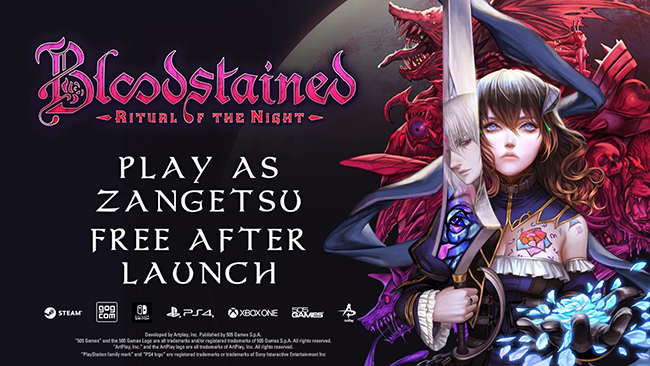 | Bloodstained: Ritual of the Nigh Second Playable Character Revealed KILL EVERY LAST DEMON Zangetsu’s vengeance against the demons of hell is a raging inferno that knows no peace. Play as the demon hunter samurai in Bloodstained: Ritual of the Night, FREE after launch! Zangetsu is brought to life by the awesome voice talents of David Hayter, (Snake – Metal Gear series) and brings new ways to play, explore and experience the story of Bloodstained. Equip the deadly Zangetsuto katana and ravage your enemies with devastating elemental talisman magic. Traverse the impossible with his chain hook and discover all the secrets that await in Bloodstained: Ritual of the Night; launching June 18, 2019 on PC, PS4, XB1 and June 25, 2019 on Switch! |