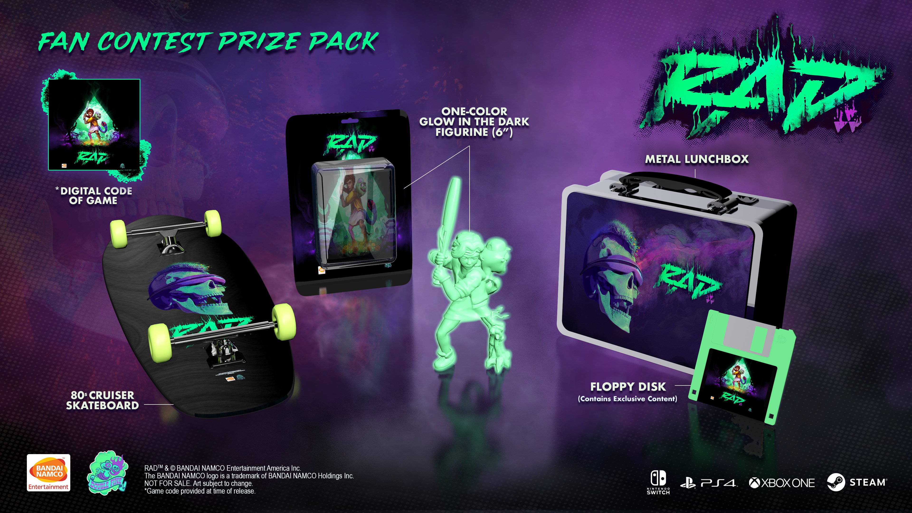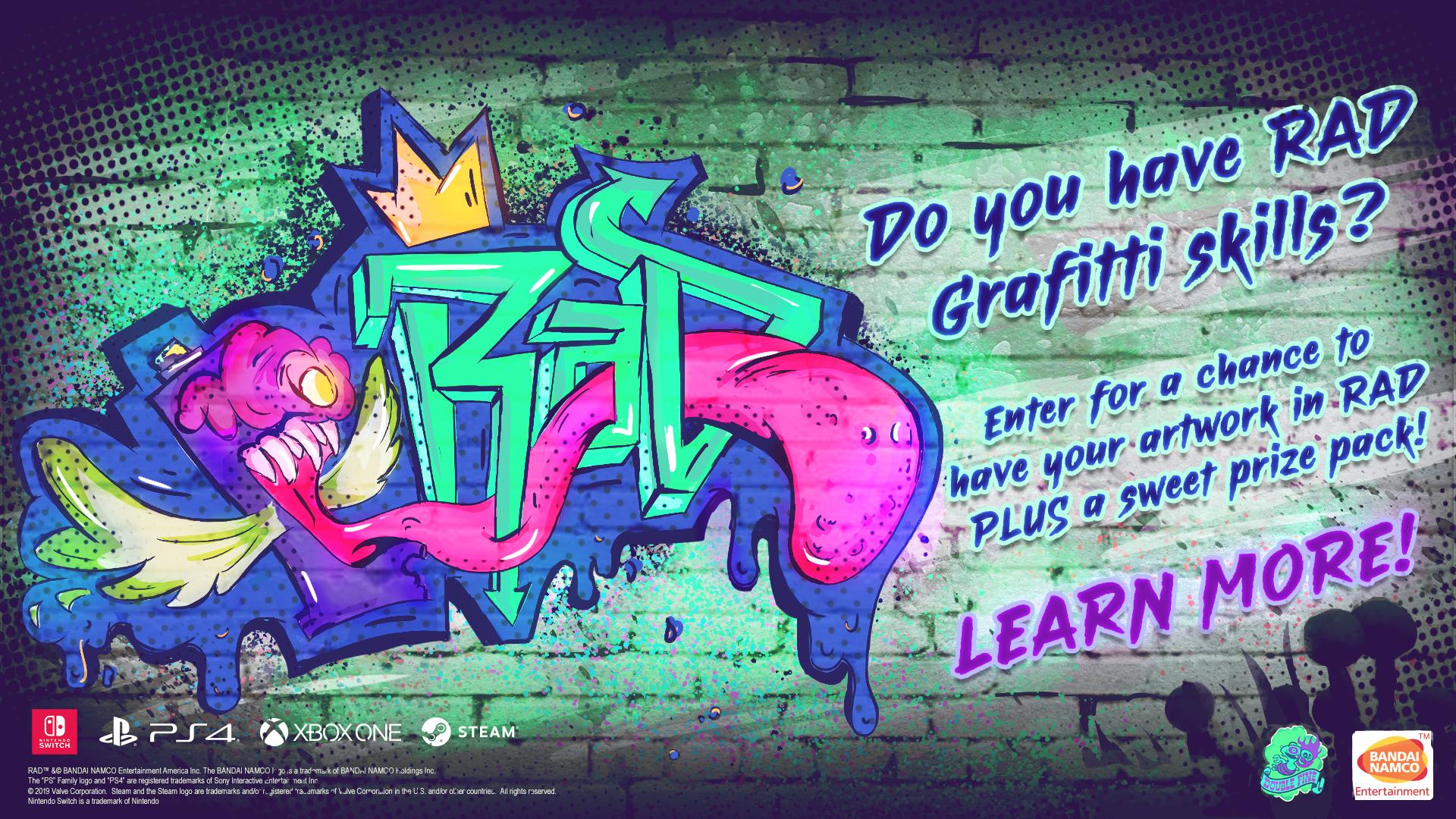 | Bandai Namco Entertainment America and Double Fine Productions’ RAD to Launch August 20 Leading video game publisher and developer Bandai Namco Entertainment America, in partnership with critically acclaimed studio Double Fine Productions, today revealed that RAD will launch for Steam, Nintendo Switch, PlayStation 4 computer entertainment system and Xbox One on August 20, 2019. But that’s not all! Today will kick off the RAD fan art contest, where the community can submit their rad graffiti designs that best represent the game. Entries will be evaluated by the development team, with the winning design being featured in the game itself, and the grand prize winner receiving additional limited swag items, including a skateboard, glow-in-the-dark action figure, lunch box and floppy disk. Two runner up winners will also be chosen to receive the limited swag items. Those interested in entering and finding official rules and regulations can visit: RADArtContest.com. “We’re almost at the home stretch and I couldn’t be more excited for everyone to jump into what we’ve built with RAD,” said Lee Petty, Project Lead at Double Fine Productions. “One of the best parts of developing RAD has been getting early feedback from the community with the Closed Beta. I want our fans and future players to know that they’re being heard and we’re going to bring an experience they’ll want to keep going back to.” RAD is a 3D action rogue-like set in a post-post-apocalyptic world, where humanity has faced Armageddon not once, but twice. Players will take on the role of a teenage protagonist who must venture into the Fallow — an ever-changing, radioactive wasteland filled with unknown and unspeakable creatures. It’s here that they’ll find the solution to heal the world, and transform the cracked, barren landscape into a lush source of new life. The fate of the world depends on the player, a sweet bat, and whatever strange new abilities they gain as the world around them ravages their body — twisting and mutating them into something far less than human, but far more powerful. For more information about RAD, please visit the official website at: bandainamcoent.com/rad. |