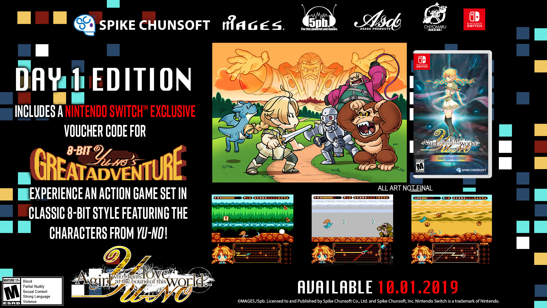| Yu-No: A Girl Who Chants Love at the Bound of this World heads to Switch on October 1st, 2019 We are thrilled to announce that YU-NO: A Girl Who Chants Love at the Bound of this World. is coming to the West on October 1, 2019 for Nintendo Switch, PlayStation 4 and Steam! Nintendo Switch Day 1 Edition includes a voucher code for 8-BIT YU-NO'S Great Adventure. Experience an action game set in classic 8-bit style featuring the characters from YU-NO! PlayStation 4 Day 1 Edition includes a mini cloth poster featuring Eriko Takeda, the mysterious school nurse at Sakaimachi Academy. Secure the Day 1 Edition today! About YU-NO A girl who chants love at the bound of this world. Your Love Awaits Beyond This World. During his vacation from Sakaimachi Academy, Takuya Arima receives a package from his supposedly deceased father. It contains the mysterious Reflector Device which allows the user to travel between parallel worlds. With help from his friends, teachers, and lovers, Takuya must unearth the mystery of his father's legacy to prevent a calamity threatening to envelop reality itself. Key Features • The Power of the Reflector - Explore multiple timelines and revisit events through the unique gaming mechanic of the Reflector Device. This allows you to explore every timeline in detail. Activate the Reflector Device’s Auto Divergence Map System to return to an event with more knowledge and new items. • Your Father's Clues - Solve all the mysteries of Sakaimachi to uncover the secrets lying beneath Sword Cape. Collect items from one timeline and use them in the next to unlock Sword Cape's hidden truth. • Love Beyond Worlds - Can you find the hidden world waiting beyond Sakaimachi? Fall in love with every character to reach the true ending to this 40+ hour visual novel. YU-NO Localized Release Changes We would like to inform the community about the following content changes made to the game in order to secure a release in the West on consoles. The following changes will be included in the localized Nintendo Switch and PlayStation 4 versions: Sala Oasis Scene - A sunbeam is placed over Sala’s naked lower body. Symbols - Some cursor interaction symbols have been replaced with the “investigation” symbol. The story content and gameplay remains the same; only the cursor symbol itself has been replaced. These content changes will not be applied to the Steam(PC) version. The Steam version will contain identical content to the Japanese Nintendo Switch release. |