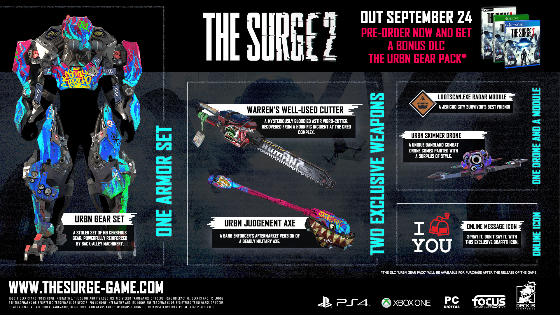 | The Surge 2 gets a release date – Preorders are now live The Surge 2, Deck13’s incredible follow-up to the hardcore sci-fi action-RPG The Surge published by Focus Home Interactive, will be available worldwide September 24 on PlayStation 4, Xbox One, and PC. Players who preorder at participating retailers will receive the URBN Gear Pack DLC for free, which includes an armor set, two weapons, one drone, one module, and a bonus online message icon (check listings for local availability). The Surge 2 Limited Edition is now also available for pre-order, including an exclusive lenticular cover, an 8-page comic book, a massive double-side poster and three lithographs. The Limited Edition is available from select retailers worldwide. The Surge 2 comes to PlayStation 4, Xbox One, and PC on September 24. |